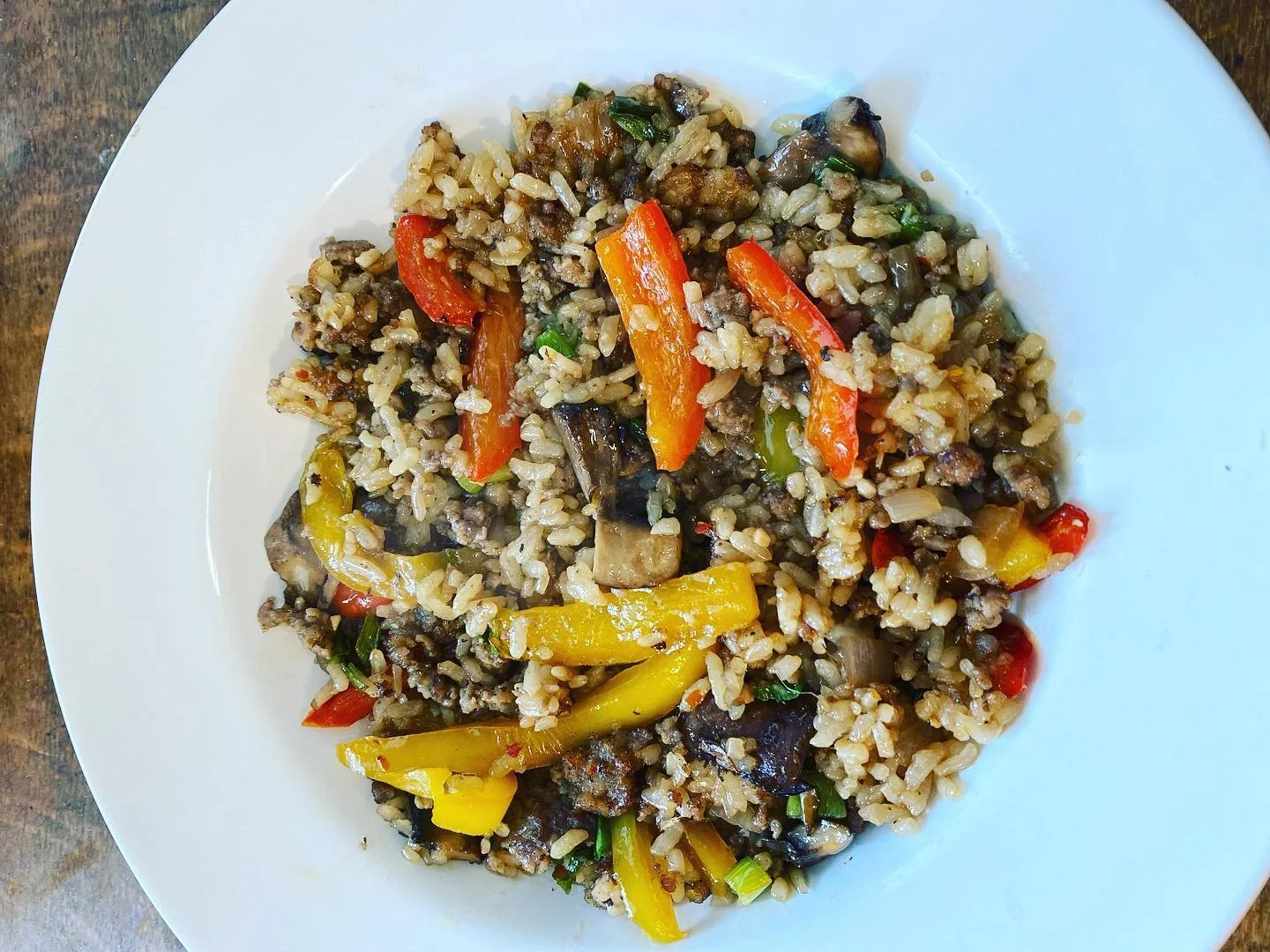 Preheat oven to 450 degrees. Start by cooking and browning the pork in a large pan or wok on medium high heat. While the pork is cooking dice the onion and bell peppers. After pork is fully cooked remove from pan and set aside. In the same pan begin sautéing the onion and bell peppers. Add a bit of olive oil if needed Once the onion and bell peppers are tender add in mushrooms. While the vegetables are cooking whisk together the soy sauce, sesame oil, garlic, and ginger. Once the mushroom are deeply brown in color, add rice. Pour the soy sauce mixture over the rice and stir the vegetable, sauce and rice to combine. Slice up green onions and add. Add the pork back in. Once everything is well incorporated and mixed, take the mixture and spread it on a sheet pan. Bake it in the oven at 450 degrees for 15 minutes until the rice starts to crisp. Once the rice has reached it’s desired crispiness, let cool and indulge.