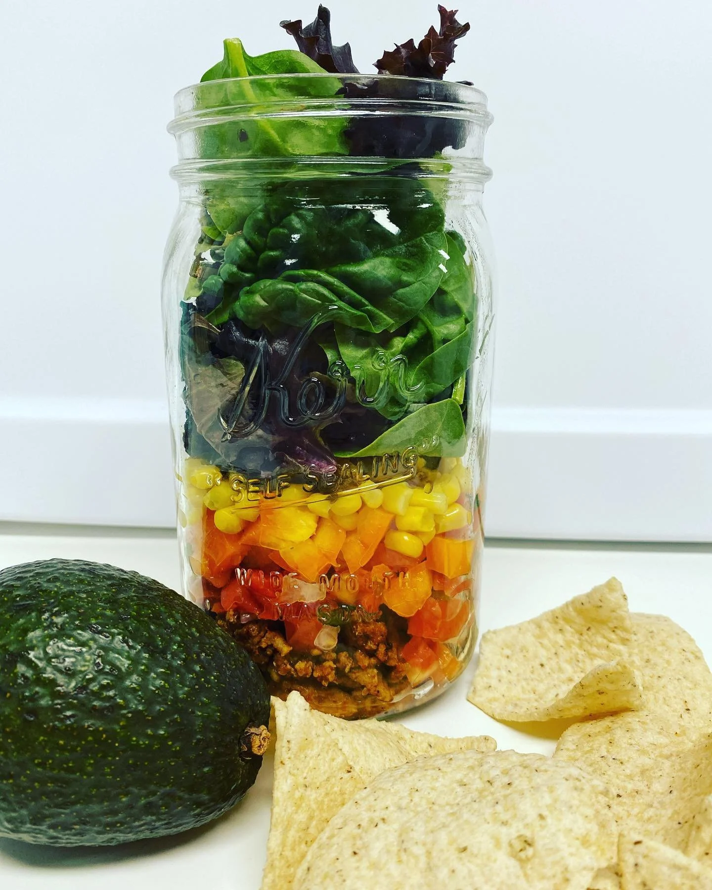 Start by browning your ground turkey. Once it is browned add in taco seasoning packet. Allow the meat to cool and make dressing. Add all ingredients for dressing to a bowl and whisk well. Pour into a glass jar and set aside. Slice up your orange bell pepper and jalapeños. Get out 5 mason jars. Start by evenly distributing your cooled taco meat to the bottom of the jar. Then add 1/4 cup of pico de gallo to each jar. Next, evenly distribute the orange bell pepper amongst all 5 jars. Now add 1/4 cup of corn to each jar. Then add 2 tbsp. of chopped jalapeños to each one. Lastly, add 1 cup of spring mix to each jar. Place jars in the fridge. When it is time to eat, pour the salad into the bowl, top with avocado and crushed corn chips, and add dressing.