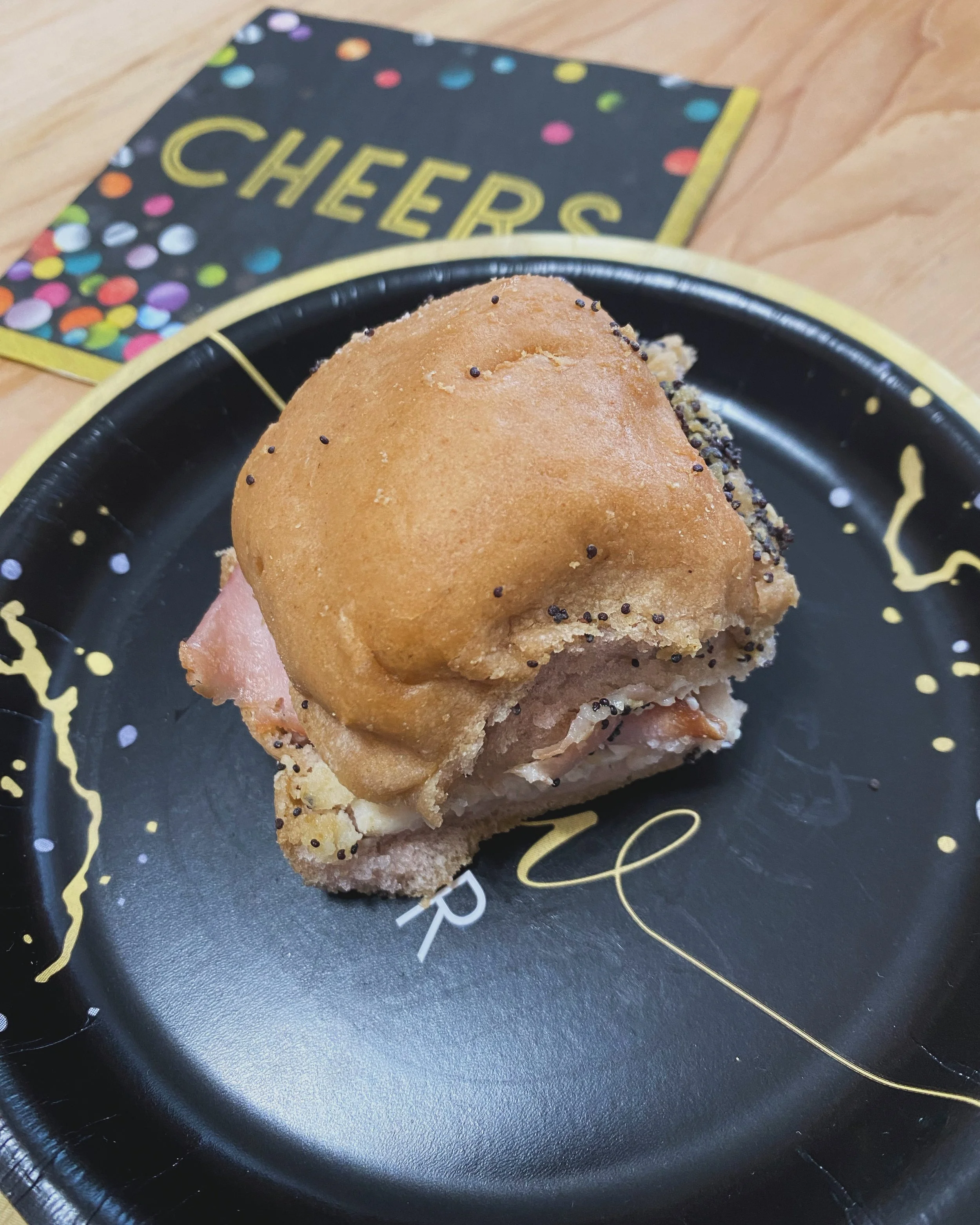 Preheat your oven to 350 degrees. Slice the all 24 rolls in half. Spread cream cheese evenly on one side of the rolls and mayo evenly on the other side. Fold the ham into quarters and place a slice on each segment of the sandwich rolls. Melt you butter and add in the mustard, Worcestershire, poppy seeds, and minced onion. Whisk until combined. Pour the butter mixture over all the rolls. Bake in the oven for 20 minutes. Slice up and enjoy!