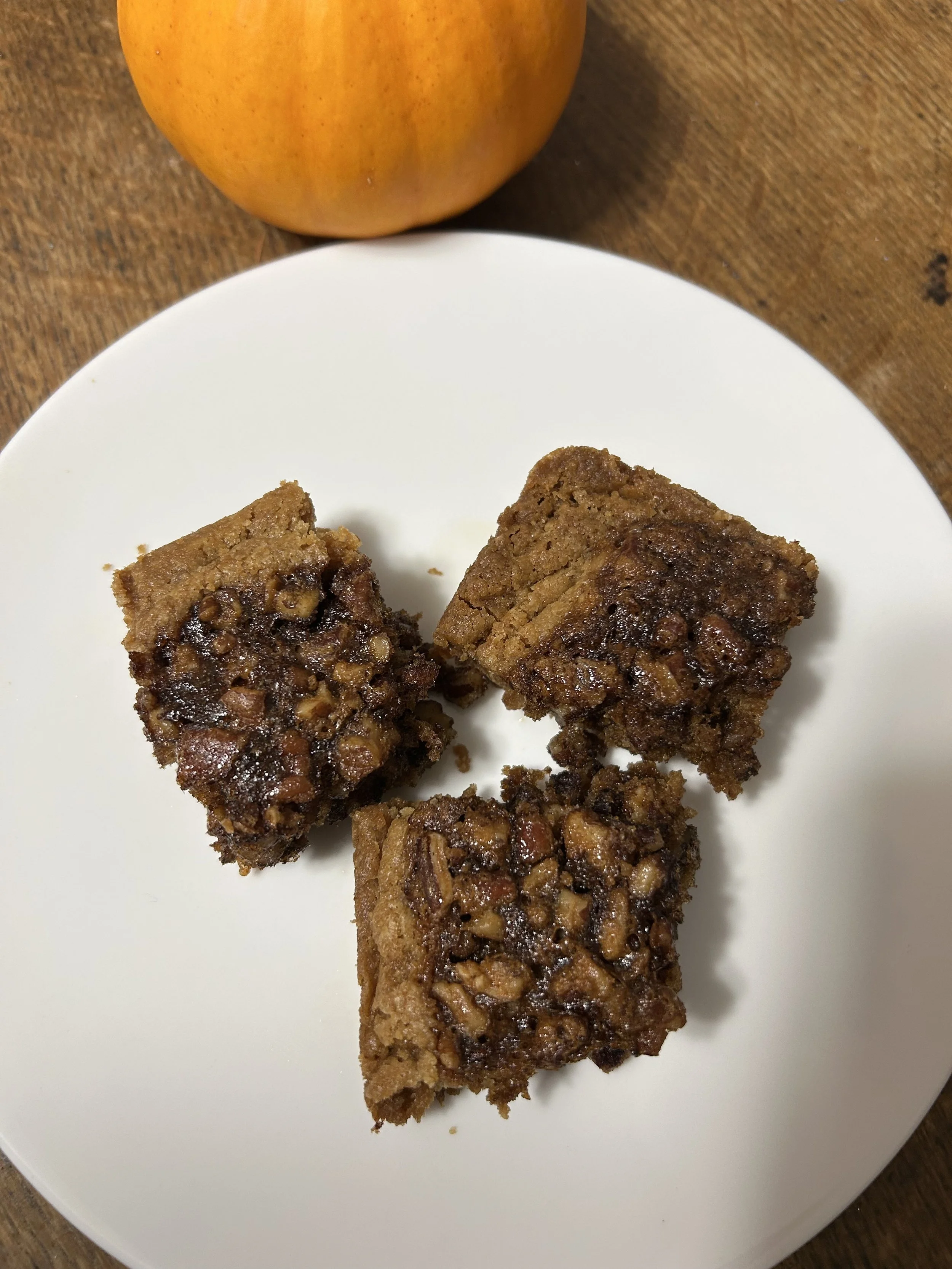 While the crust is cooking, mix the filling in a bowl. Mix together the brown sugar, GF flour, baking soda, salt, melted butter, eggs, vanilla. Fold in the pecans.