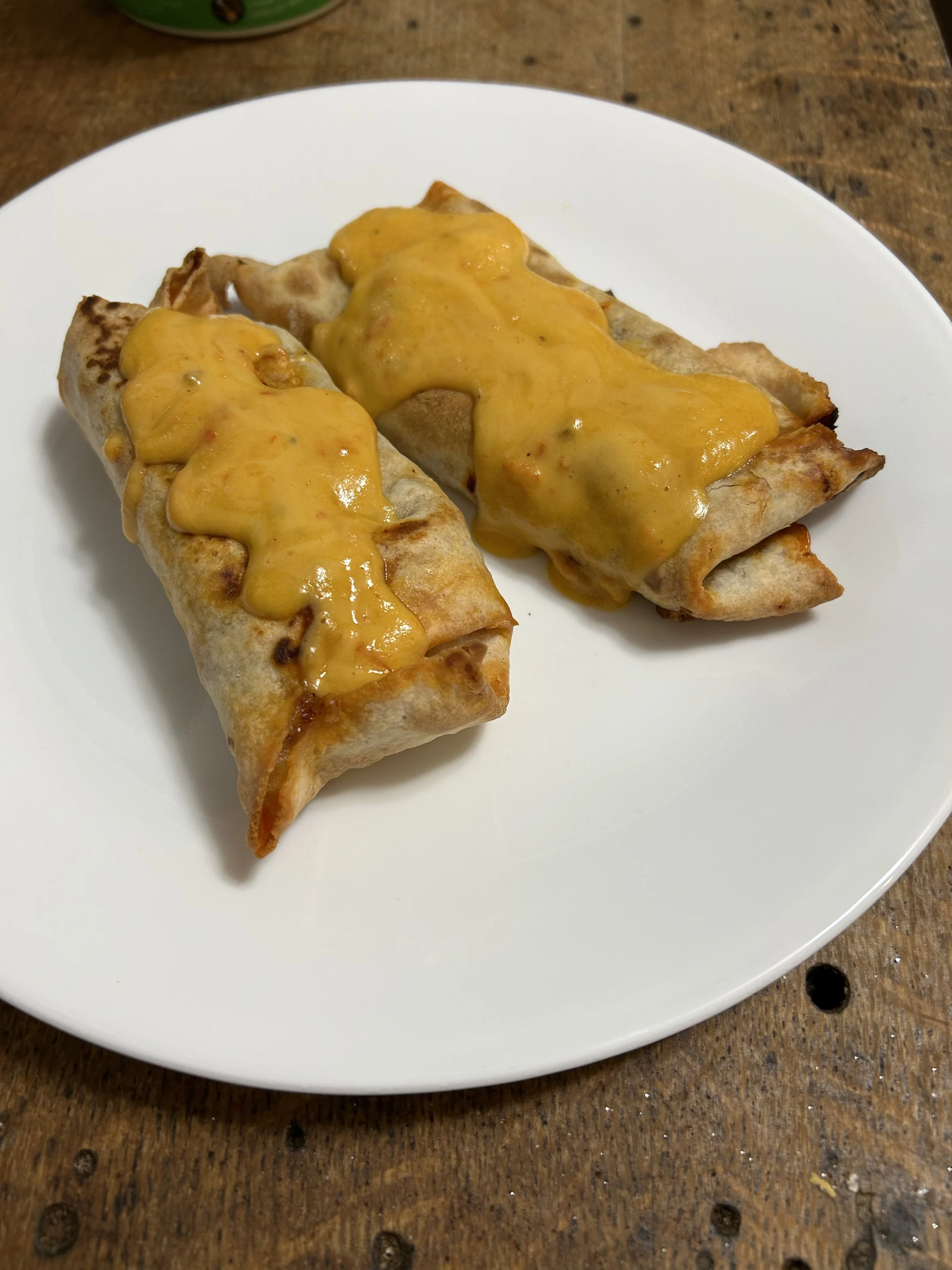 Let the chimichangas cool and add toppings. I add Kite Hill Dairy Free Queso. Enjoy!