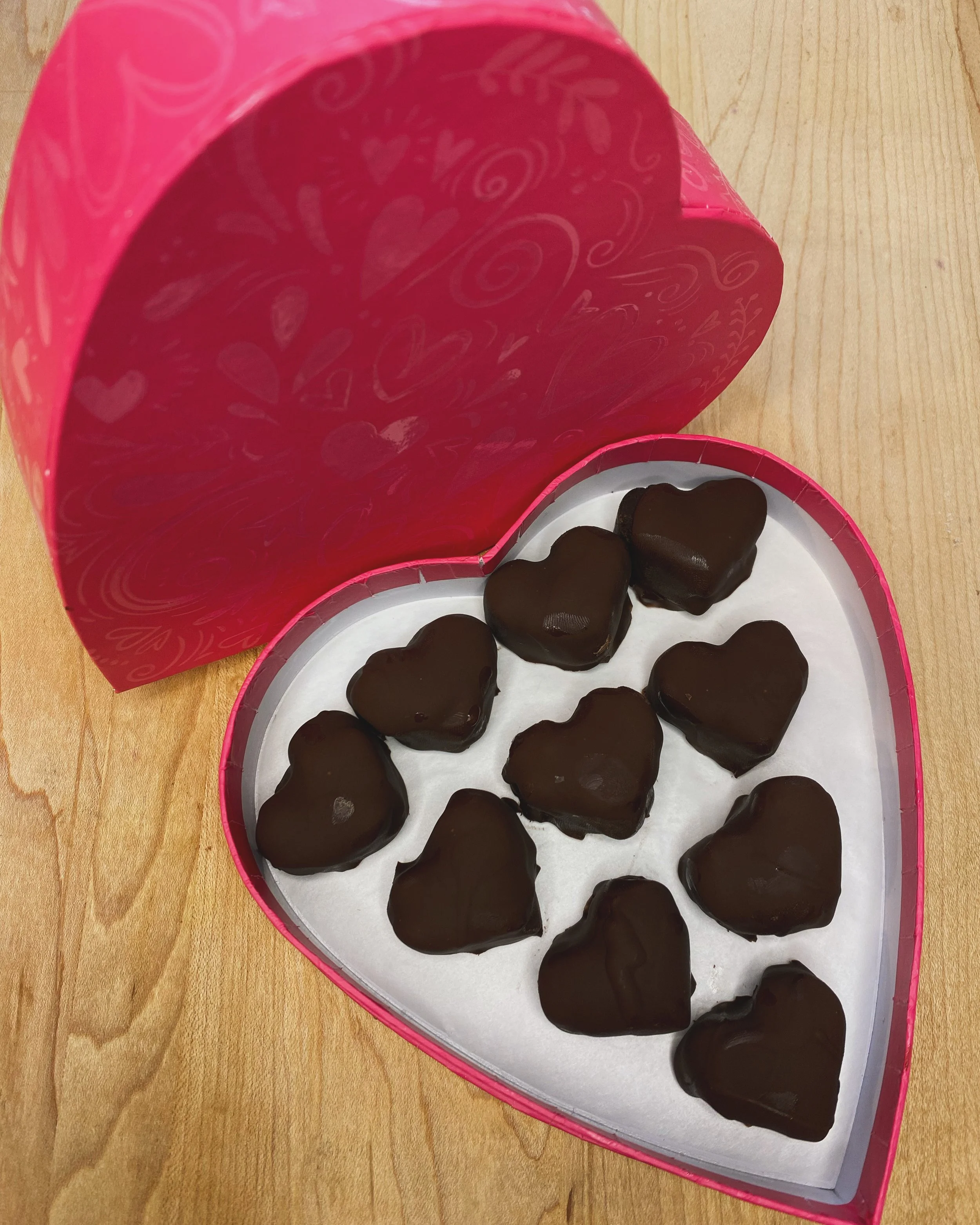 Put 3/4 cup of chocolate chips and the milk in a microwaveable bowl. Melt until the milk and chocolate are well combined. Add in the cocoa powder. Stir to form the inside of the truffles. Split the truffle mixture evenly between four bowls. Add 1/4-1/2 tsp. of each extract to each bowl and stir well. Place the flavored truffle batter in chocolate heart molds. Place in the freezer for 15-30 minutes to harden. Melt 1/4 cup of chocolate chips and 1 tsp. of coconut oil together. While the truffles are still in the mold, add the melted chocolate evenly to the bottom of each truffle. Let freeze for five minutes. Pop the truffles out of their molds and place on a wire rack. Place the wire rack on a sheet pan lined with wax paper. Melt the remaining chocolate chips and coconut oil together. Coat the truffles with melted chocolate. Allow the chocolate to harden in the fridge for at least 15 more minutes. Take a bite and enjoy!