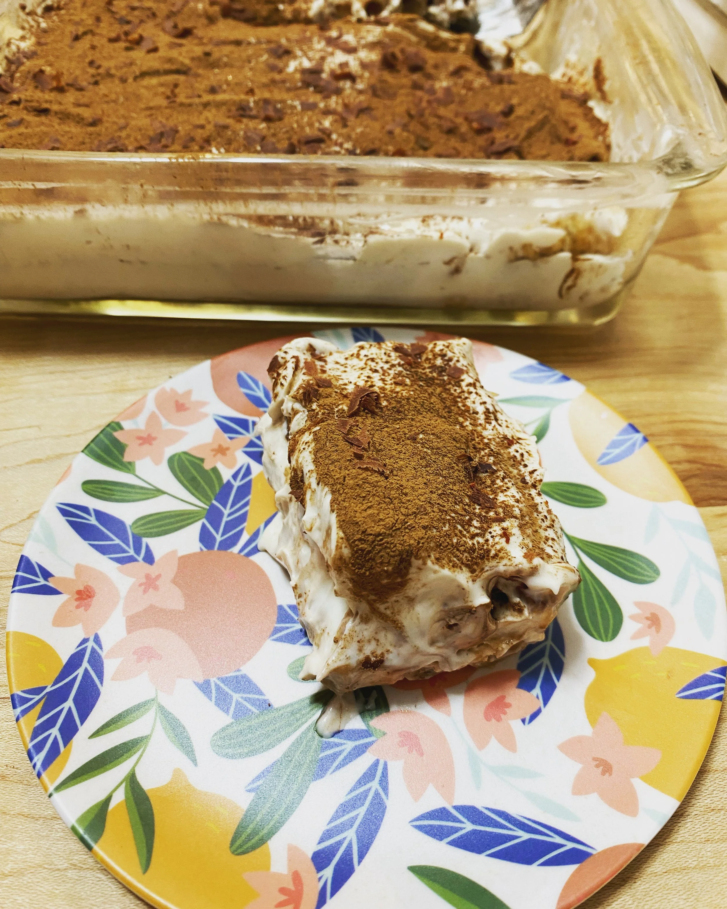 Dip coconut rolls in cold espresso and layer the bottom of a greased 8x8 glass baking dish. Mix together the whipped topping, cream cheese, sugar, and vanilla in a bowl. Spread half of the whipped topping over the layer of coconut rolls. Shave a layer of chocolate on top of the cream cheese mixture. Repeat this process for the next layer. On top add shaved chocolate and cocoa powder to garnish. Let set in the fridge for at least 3-4 hours before serving. Slice and devour.