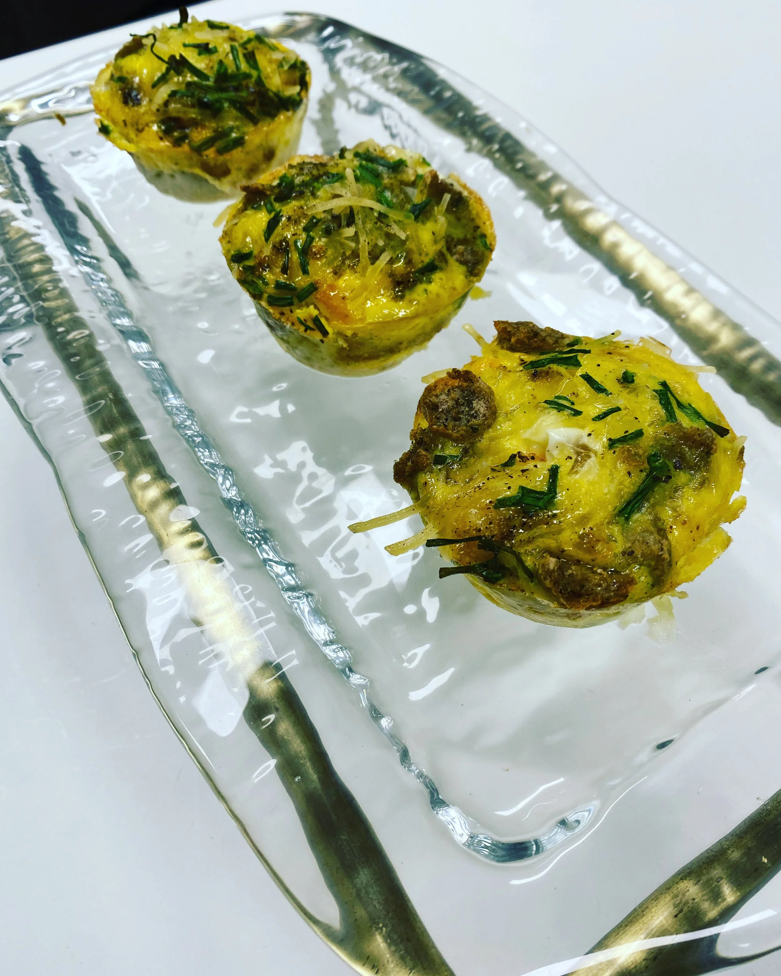 Heat your oven to 350 degrees. Take a cupcake tin and grease it very well with cooking spray. Layer the bottom of each cupcake space with mini tater tots. I used 5 per cupcake space. Then beat one egg at a time and dump it over the tater tots in each cupcake space. Next put a heaping tablespoon of your protein on top of each egg bite. Then sprinkle 2 teaspoons of cheese and one teaspoon of chives over each one. Sprinkle salt and pepper over each egg bite. Place in the oven for 15-20 minutes or until the eggs are fully cooked. Then turn on broil and let the egg bites cook until golden brown on top. Mine took 3 minutes, but everyone’s broiler is different. Let cool for 10 minutes. Take each egg bite out of the cupcake tin to cool on a plate. Then take a bite!