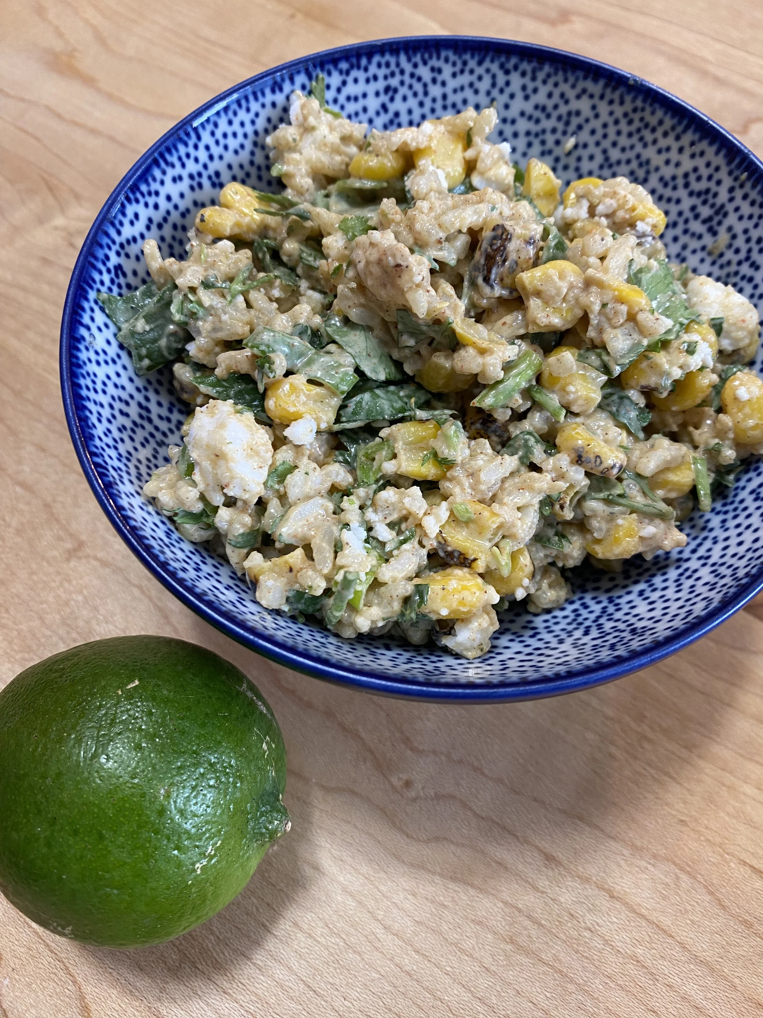 Make your rice, and allow it to cool while you chop the vegetables and make the dressing. In a small bowl mix together the yogurt, lime juice, and spices. In a large bowl add in the rice, corn, green onions, and cilantro. Mix well. Pour in the yogurt dressing and coat everything well. Fold in the feta. Serve up and enjoy!