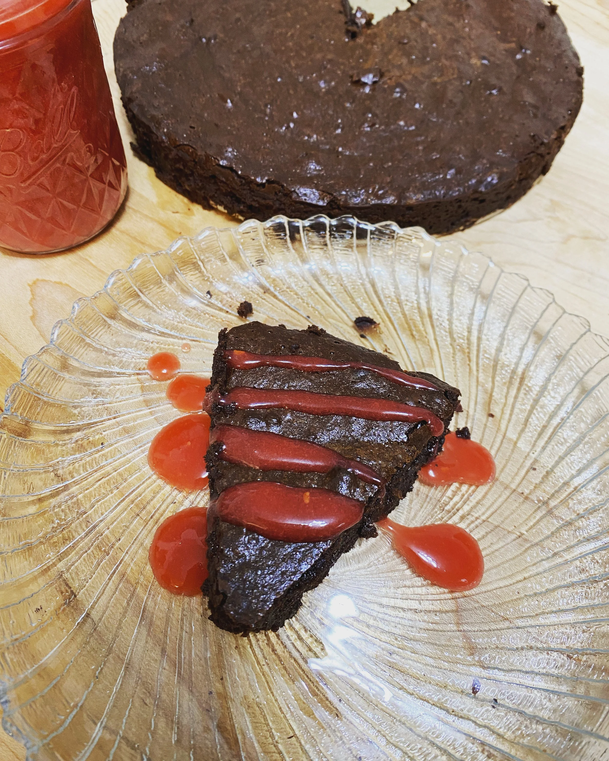Preheat your oven to 375 degrees. Grease an 8-inch cake pan and place parchment paper on the bottom. Melt the chocolate chips and the butter in the microwave for one minute. Stir and microwave in 30 second increments until everything is melted and well combined. Stir in sugar, salt and vanilla. Then, stir in the eggs until well combined. Then, add in the cocoa powder. Place the batter in pan and bake for 25 minutes. Let it cool for 5 minutes.