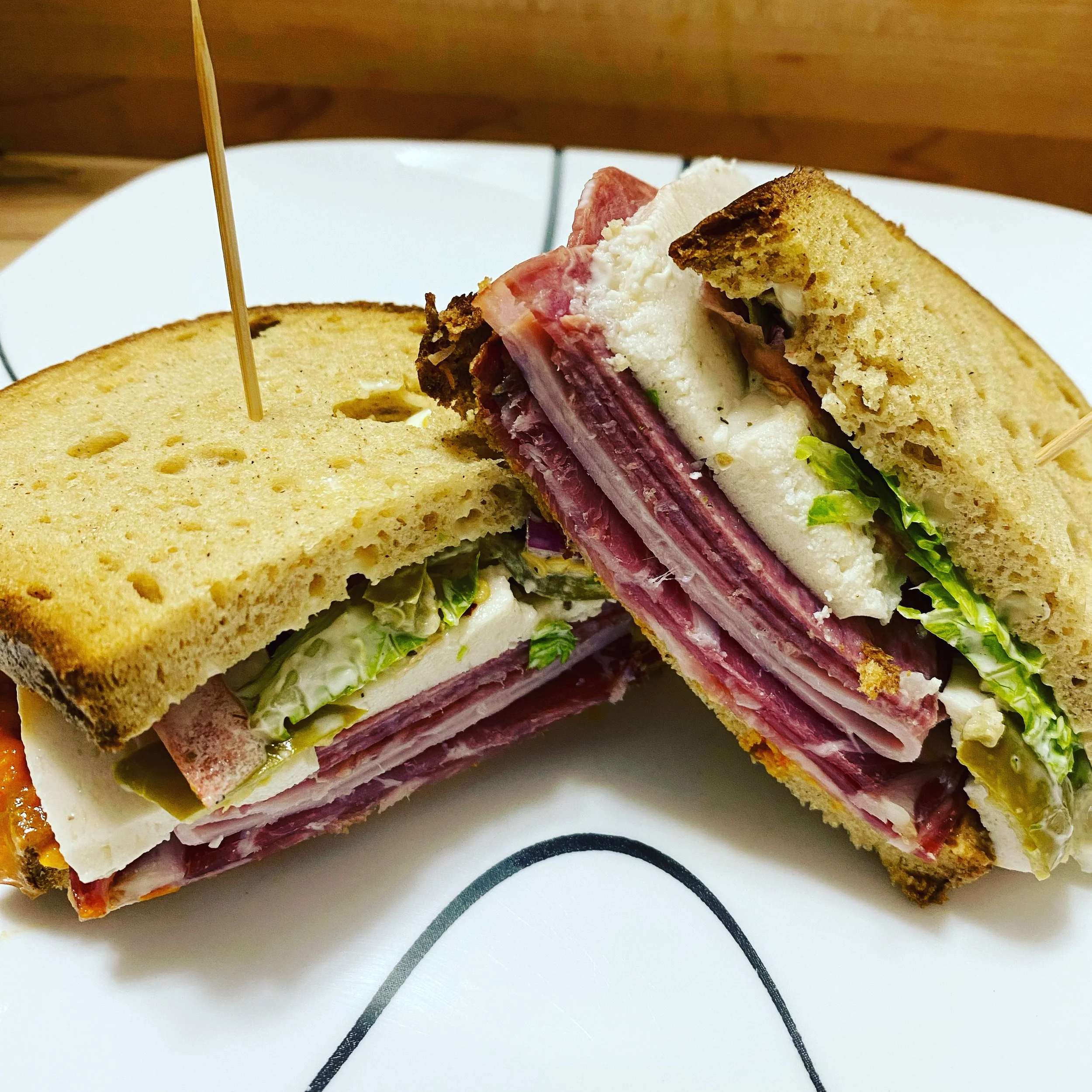 Toast bread. On one side of the bread spread on red pepper pesto. On top of the pesto layer on all the sandwich meats and mozzarella cheese. Place tomato on top of the mozzarella. In a small bowl combine mayonnaise, vinegar, pepper, oregano, and chili flakes. Add in the cherry peppers, red onion, and lettuce and toss in the dressing. Add it to the top of the sandwich on top of the tomato. Add a layer of mayo to the top piece of bread and close the sandwich. Cut in half and enjoy.
