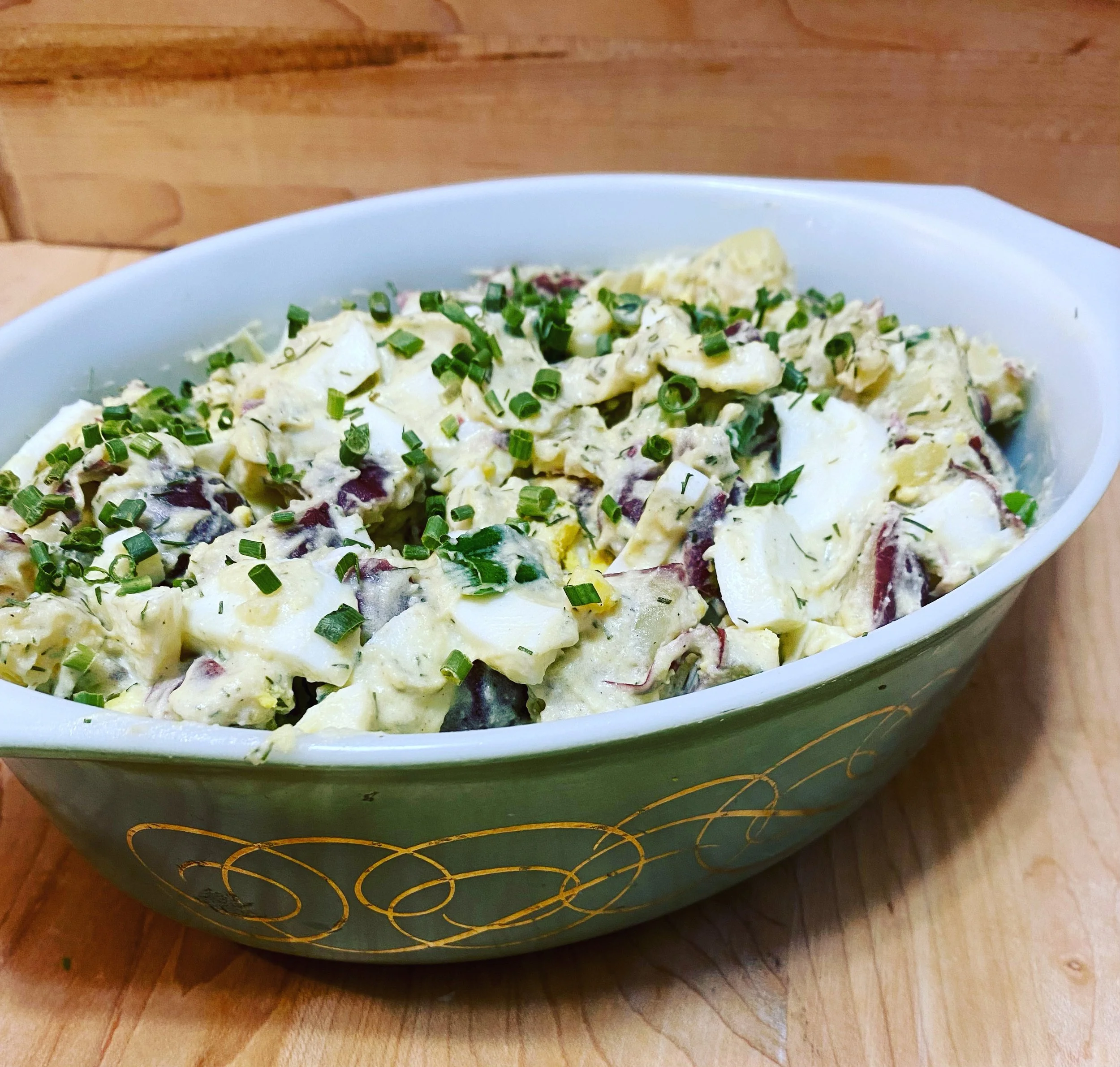 Start by putting the red potatoes in a large pot with cold water, bringing them to a boil. Boil the red potatoes until they are fork tender. While the potatoes are boiling begin mixing the dressing together. Add in the mayo, mustard, spices, and vinegars to a large bowl. Mix together well. When the potatoes are done, rinse them in the sink under cold water and allow them to cool for ten minutes. Cut the potatoes into bite sized pieces. Add your warm potatoes to the dressing and coat them well. Fold in the chopped hard boiled eggs. Mix in the green onions. Allow the potato salad to chill in the fridge for 2 hours to overnight. Serve up and take a bite!