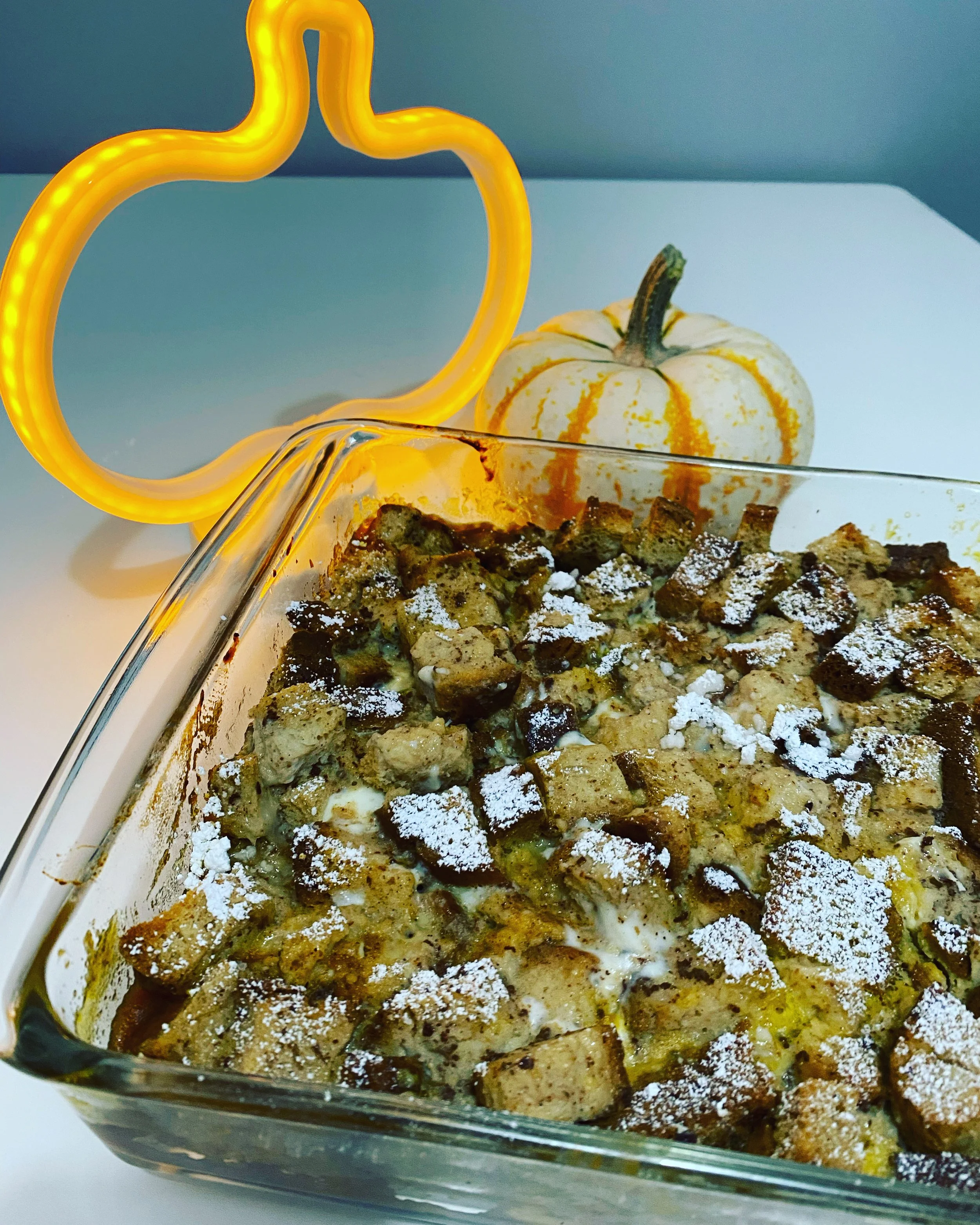 Prehat the oven to 425 degrees. Spray an 8x8 glass cooking dish with cooking spray. Spread the jar of pumpkin butter on the bottom of the pan. Place the cubed bread on top of the pumpkin butter. In a medium bowl whisk together the eggs, milk, cinnamon, and vanilla. Pour the egg and milk mixture evenly over the cubed bread. Place the dish in the oven for 15 minutes uncovered. Then take it out and bake it for 5-10 more minutes covered with tin foil. The top should be slightly crispy, but not get too brown. Let cool for 5-10 minutes. Dish up and enjoy.