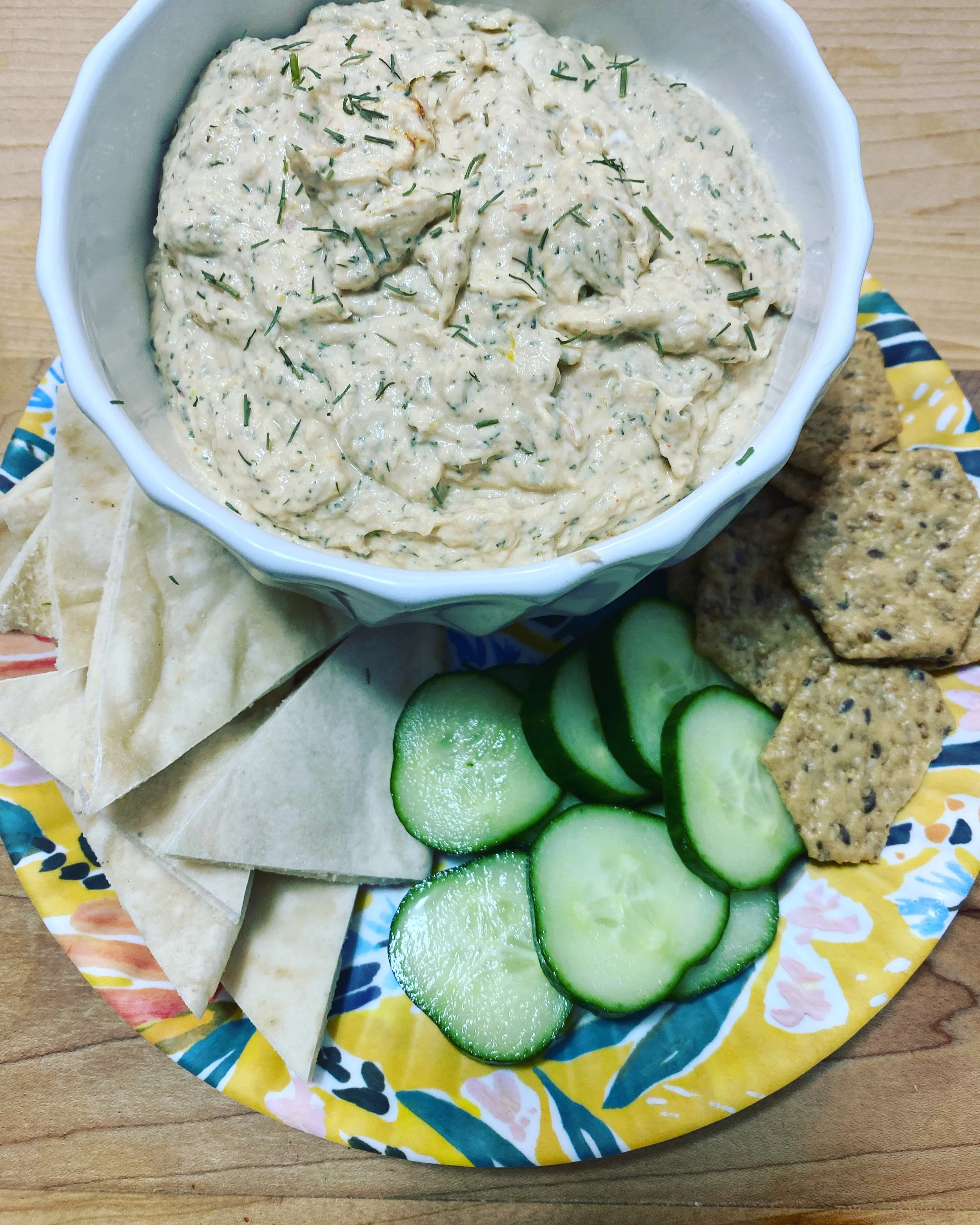 Place all ingredients for the dip in the food processor. Blend until smooth. Scoop dip into a bowl and serve alongside crackers, pita, and sliced cucumbers.