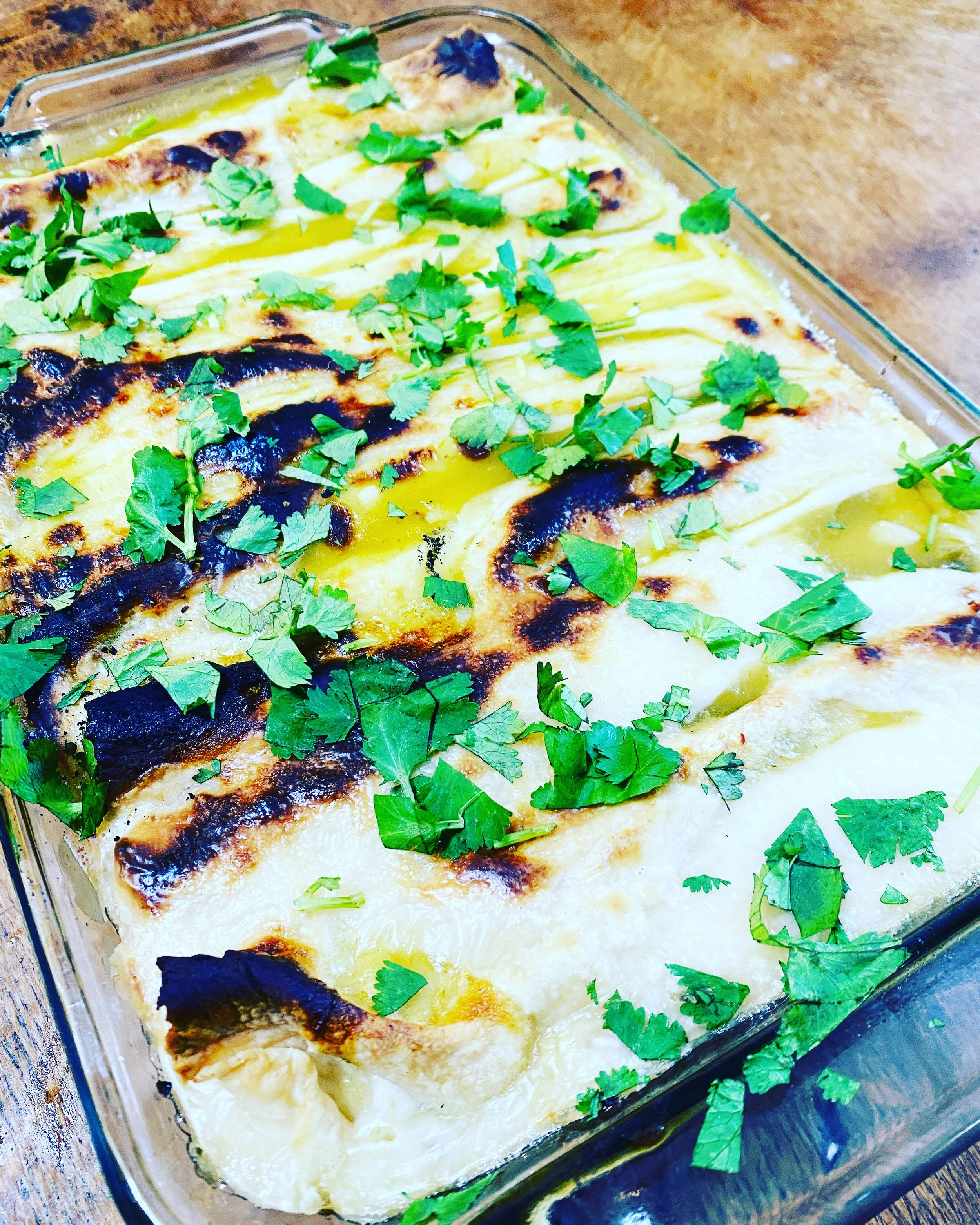 Preheat the oven to 350 degrees. Chop the poblanos into strips and the onions into half moons. Add some olive oil to a skillet and sauté the onions and poblanos until soft. Then add in 1/2 can of enchilada sauce and the minced garlic to the skillet. Cook until garlic is fragrant and remove from the heat. In a large bowl, add the cooled poblano and onion mixture to the chicken and mix together. Add in cubed or shredded mozzarella cheese and mix together. In 8 x 11 greased pan, add 2/3 to 1 can of green enchilada sauce to the bottom of the pan. Spoon 1/2 cup of the filling into a tortilla and roll up. Place seam side down in the pan. Repeat until the pan is filled. Then evenly pour one can of green enchilada sauce over the top of the enchiladas. Next, pour or sprinkle the mozzarella over the enchiladas so it is evenly covered. Cook in the oven for twenty minutes until the cheese is slightly brown and bubbly on top. If cheese is not bubbly, broil for a few minutes until it is. Indulge.
