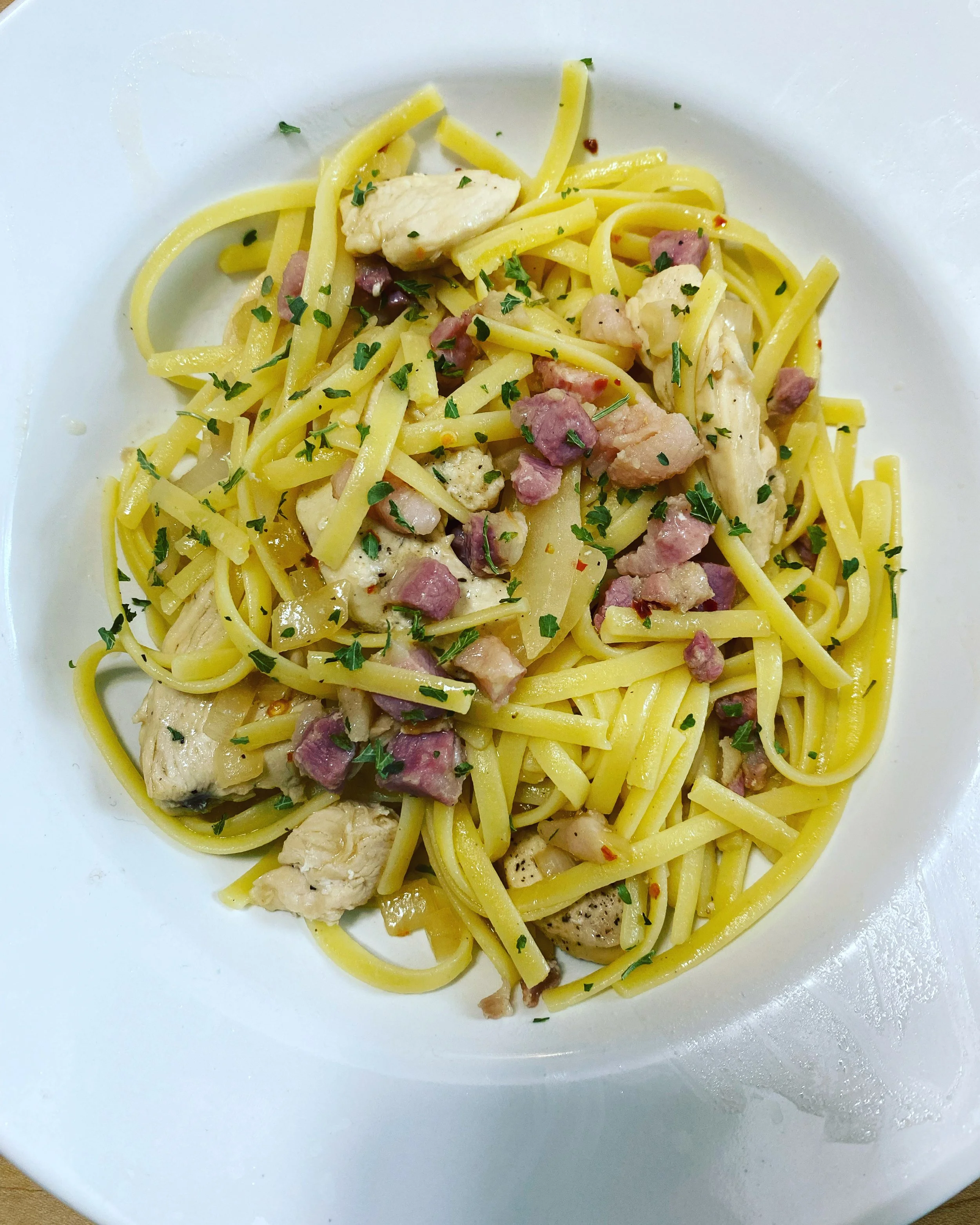 Boil water, cook noodles. Cut chicken into thin strips about 1/2 inch wide and 2 inches long. Heat pan with dairy free butter. Add chicken, cook until 165 degrees. While chicken is cooking, dice white onion and pancetta. Remove chicken from pan, keeping juices Add pancetta, white onion, red pepper flakes, garlic. Cook until onions are translucent, then add a splash of white wine to stop cooking. Add chicken back in and mix into sauce and simmer. Drain the noodles and save a little pasta water for the sauce. Add noodles to pan with chicken and pancetta. If needed, add a little pasta water. Stir and serve.